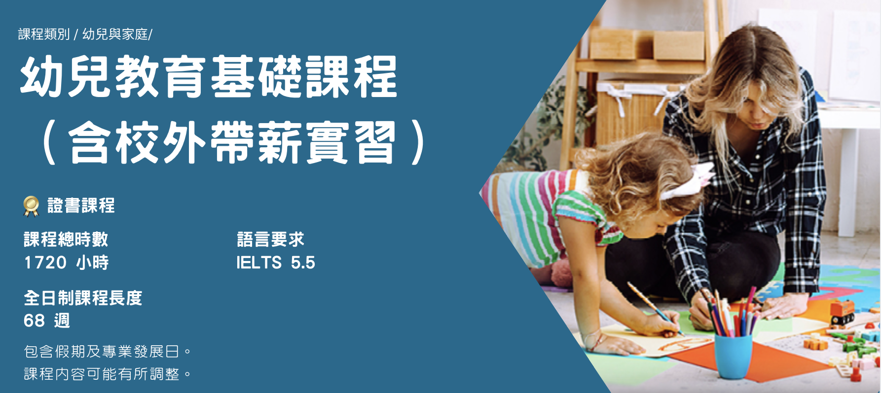 課程內容依據教育暨兒童保育部核准之課程架構設計,著重培養學生於當代幼兒教育與兒童保育領域所需之專業知識、教學技巧及職場能力。透過系統化的理論學習與實務訓練,學生將建立完整且多元的專業基礎,具備規劃、設計及帶領幼兒日常活動之能力,並能依據不同年齡層兒童之發展需求,審慎選擇適齡教材,規劃符合早期學習目標之課程與活動內容。